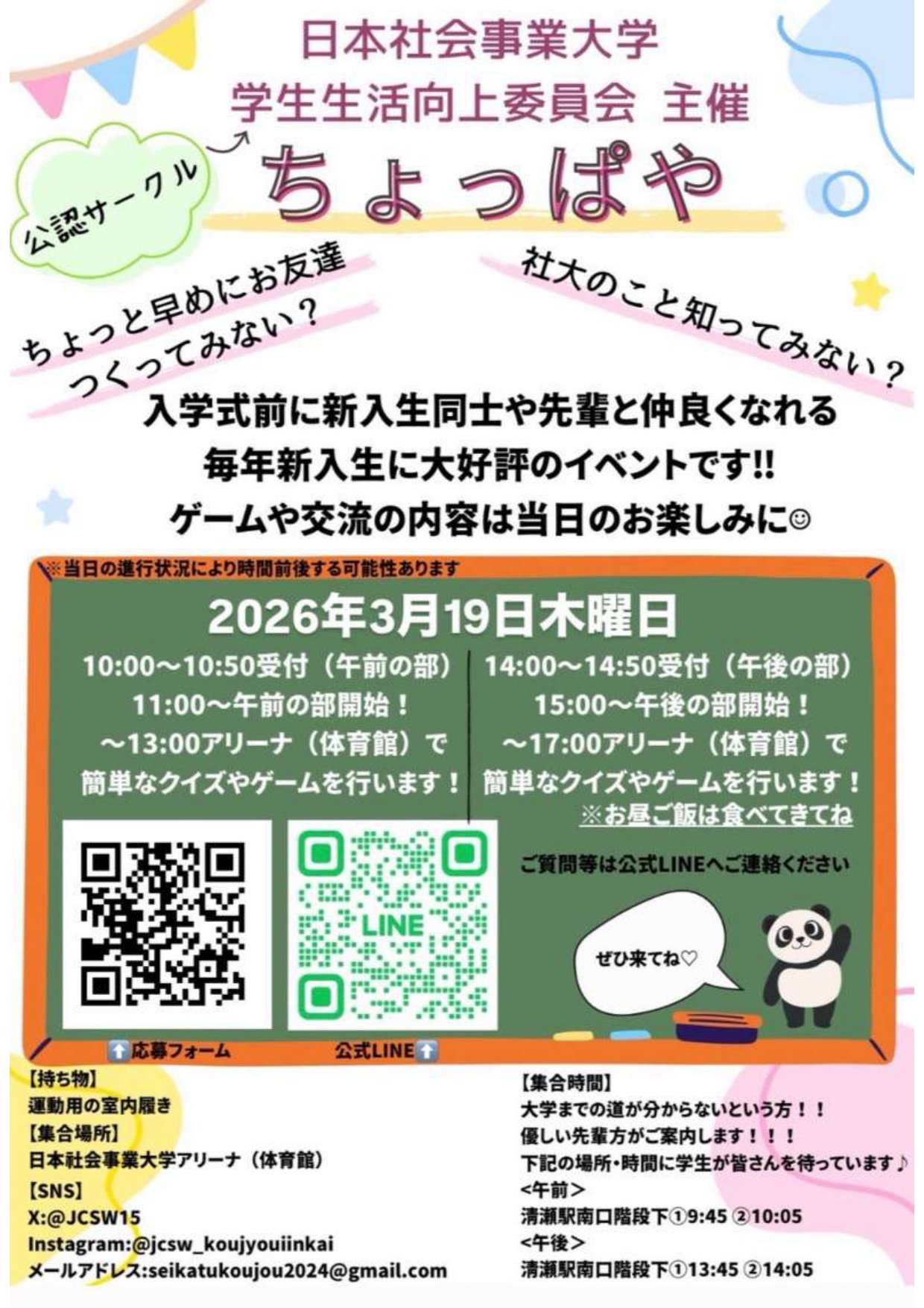 2026年3月19日(木)、本学公認サークル「学生生活向上委員会」主催で、令和8年度社会福祉学部入学予定者向けのイベント『ちょっぱや』を開催いたします。以下は「学生生活向上委員会」から新入生へのメッセージです。