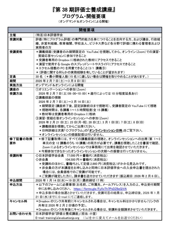 2026年2月28日、日本社会事業大学 社会福祉学部の新藤健太准教授が、日本評価学会主催「第38期評価士養成講座」において講師を務めました。本講座は、行政やNPO、教育機関などで社会課題の解決に取り組む実務者を対象に、プログラム評価の専門的知識を学ぶ研修です。新藤准教授は「プログラム評価の5階層(プロセス評価・アウトカム評価)」をテーマに講義と演習を担当しました。プログラム評価は、支援や制度が本当に役立っているのかを確かめ、よりよい支援につなげるための重要な考え方であり、ソーシャルワークの実践においても欠かせない視点です。本学では大学院でプログラム評価を専門的に学ぶことができ、学部の授業でもその考え方に触れる機会があります。
