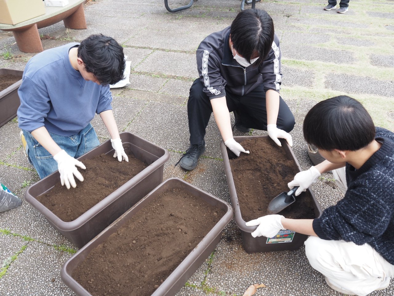 2026年3月30日(月)本学中庭において地域の老人クラブである竹水会の皆様と、第七保育園の園児の皆さんと本学学生で、じゃがいもの植え付けを行いました。